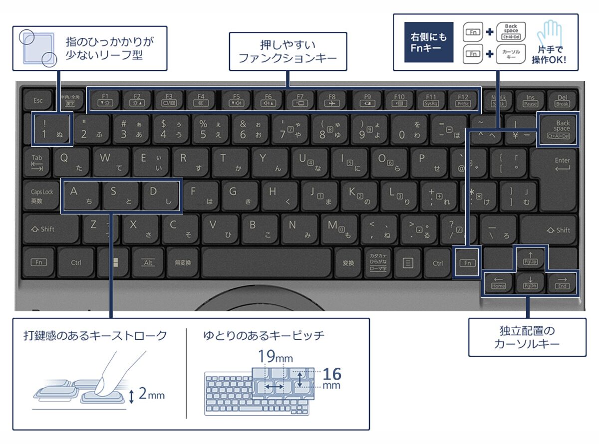 細かいポイントですが、Fnキーを使わなくてもF1~F12キーが使えるのも地味にイイ。また、シリーズ通しての一貫した操作性とキーボードの打鍵感、スペック数値以上に見やすいディスプレイなど、カタログに出ない部分での良さは実際手にして確認してみてほしい。