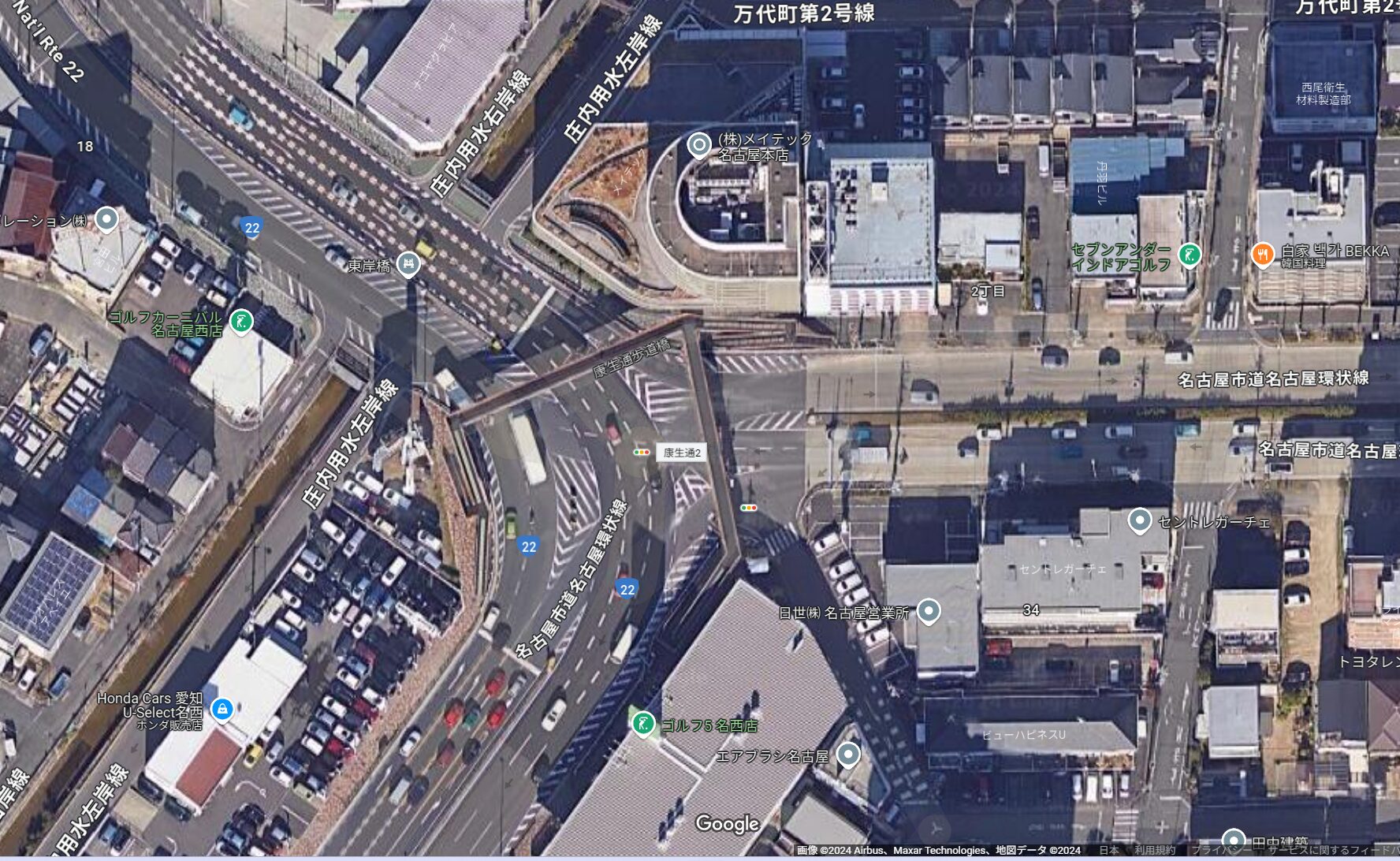 名古屋の街路は、江戸時代からの城下町の名残を残しており、碁盤の目状に整備されている部分と、そうでない部分が混在しています。特に、環状線や高速道路の出入り口付近では、既存の道路との接続を優先した結果、複雑な形状の交差点が生まれたと考えられます。