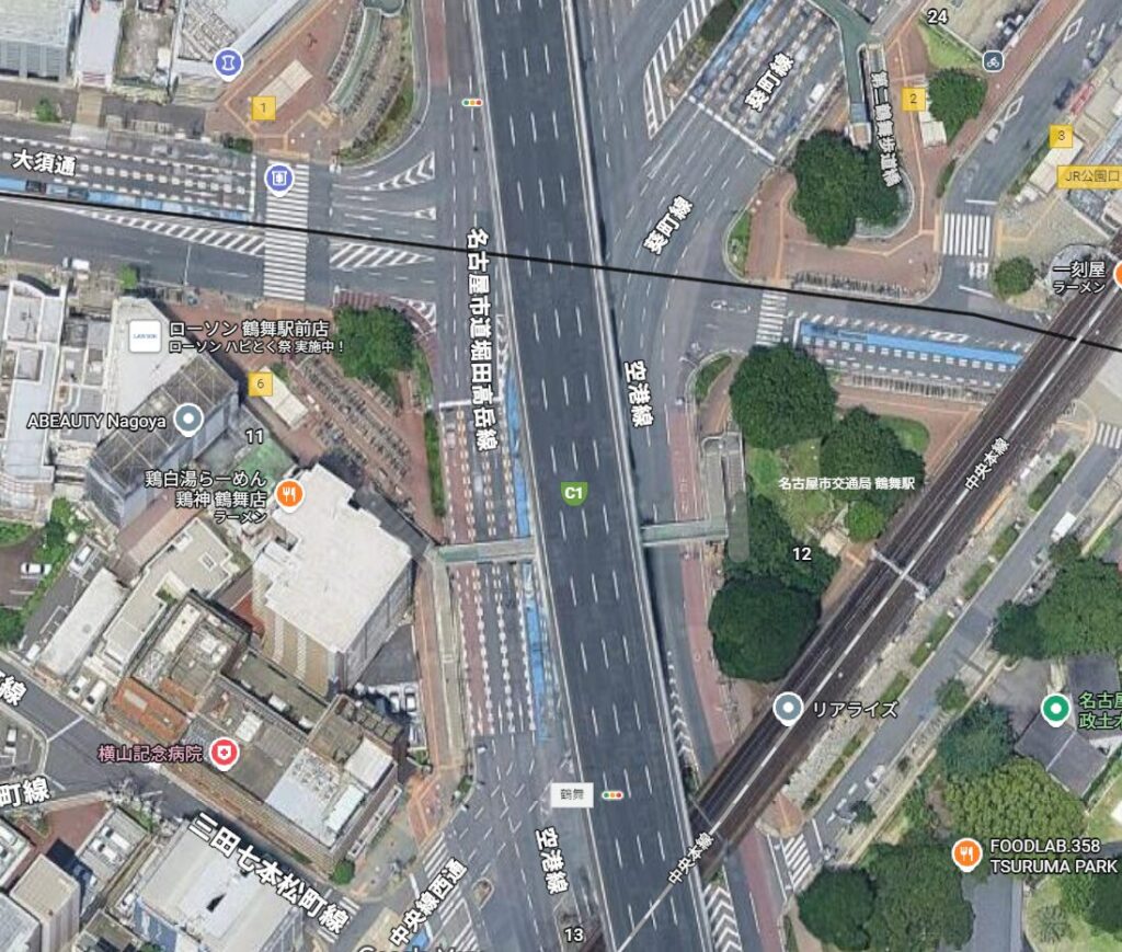 千早交差点は、若宮大通と主要道路が交差する交差点。鶴舞駅前の交差点は空港線と大須通・主要道路が交わる大きな交差点です。地下鉄鶴舞線とJR中央線が乗り入れており、鶴舞公園とも接続しているため、人通りも非常に多いです。この交差点の特徴は、斜めに交差する道路と、複数の歩道橋の存在です。歩行者にとっては非常に複雑な構造となっており、目的地によっては歩道橋を何度も渡り歩く必要があります。