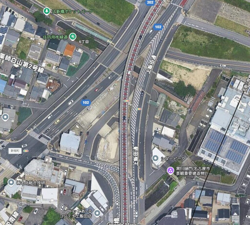 この地点は、橋と橋の中間で、慢性的に渋滞発生する地点で、春日井方向は1車線に減幅するため渋滞の要因になっています。