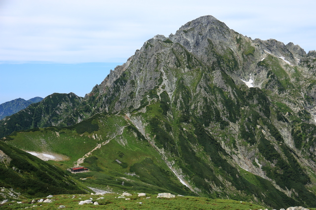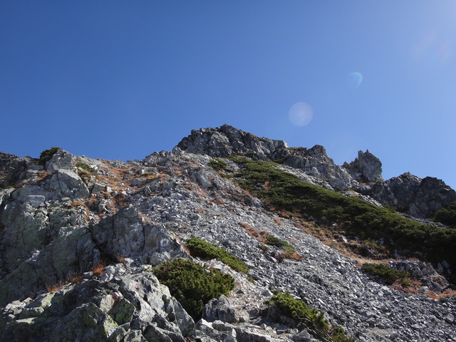 北アルプス三大急登、馬場島から標高差 2200mもあります。体力勝負の登りになるので健脚者向けと言えます。こうやって眺めてもなかなかの岩峰です。ここからは岩との闘いになりますので注意が必要です。