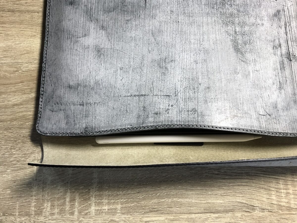 使い始めの革製品は伸びていないので入れるのも硬めです。ペンシルを挿して収納する輪があるのですが、ここへ挿すと現状本体とペンシルが干渉します。しかし底の部分にはゆとりがあり馴染んできくれば本体が奥まで入り、ペンシルも所定の位置に納められると思う。それまではiPad本体に取り付けておくのが良い(こっちの方が使いやすいかも)